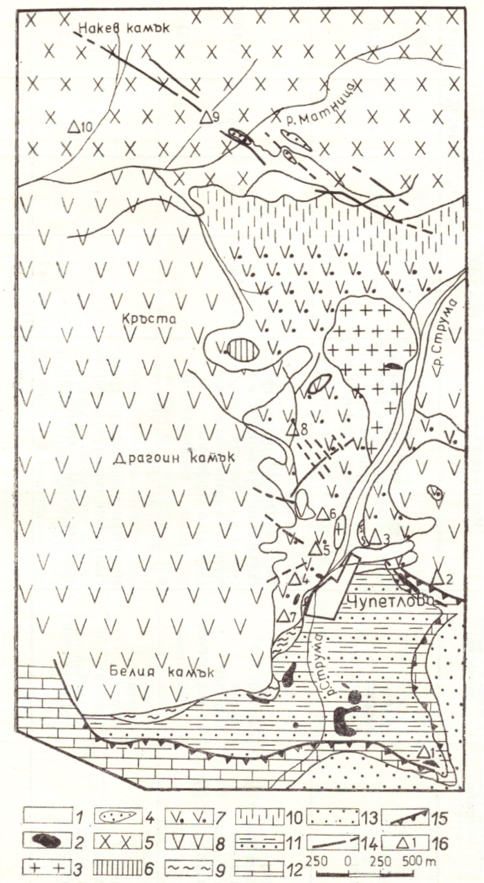 1 – кватернерна покривка; 2 – кварцдиоритови порфирити; 3 – кварцмонцонити; 4 – аплитови граносиенити; 5 – кварцдиорити; 6 – дацити; 7 – хидротермалнопроменени андезитови туфи; 8 – андезитови туфи; 9 – мергелни варовици (креда); 10 – хидротермалнопроменени фелдшпатови пясъчници (турон?); 11 – пясъчници и мергели (титон); 12 – доломитни варовици (среден триас); 13 – пясъчници и конгломерати (долен триас); 14 – разломни нарушения; 15 – навлак-възсед; 16 – рудопроявления