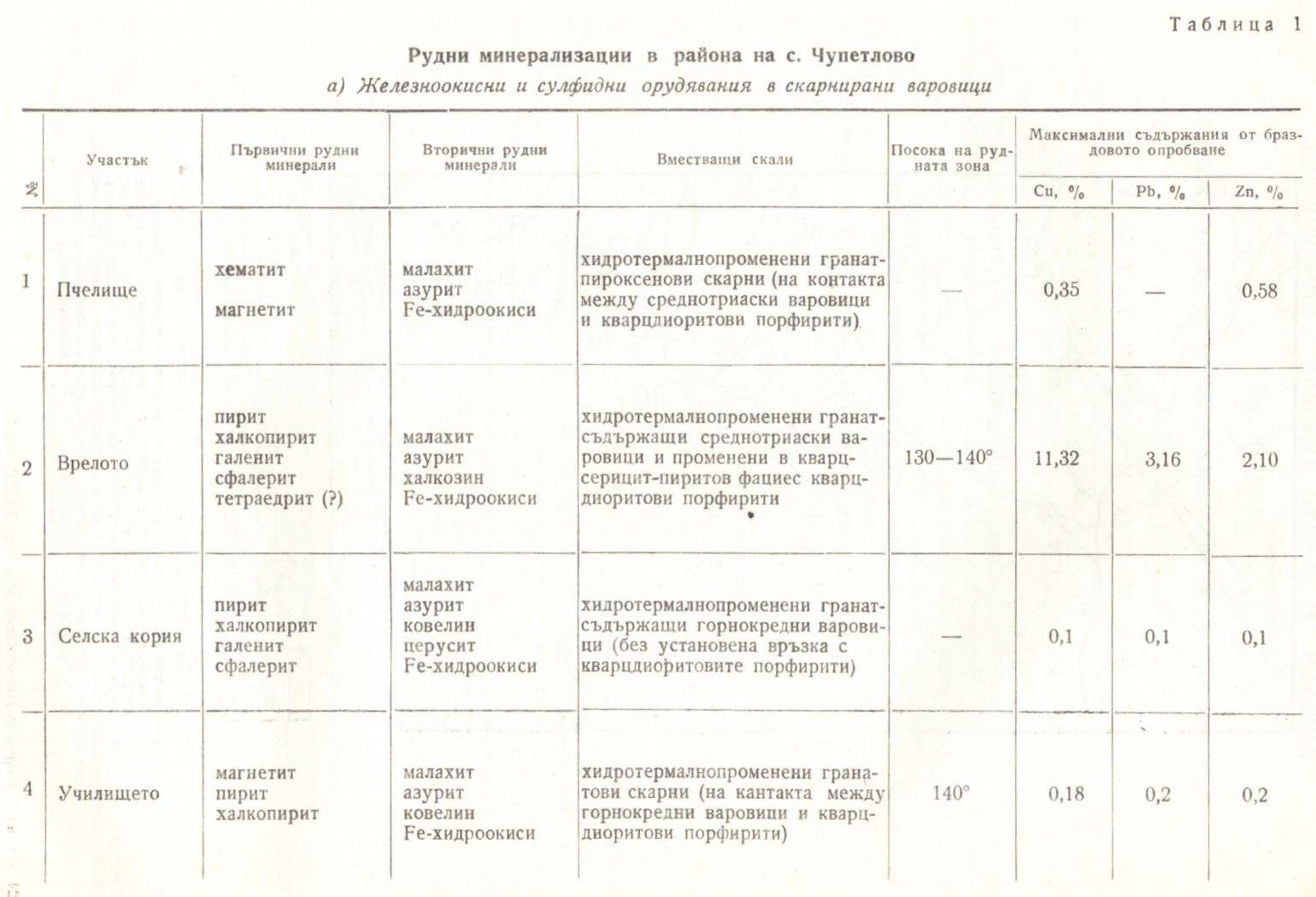 In accordance with the primary mineral composition of the ores and the nature of the country rocks, the ten ore occurrences described in the area of the village of Choupetlovo have been divided into three types: (a) iron-oxide and sulphide, formed in skarnized Middle Triassic and Upper Cretaceous limestones; (b) sulphide (chiefly vein and stockwork and disseminated types) in the Upper Cretaceous effusive and Turonian (?) feldspar sandstones, and (c) sulphide – in the quartzmonzonites of the Vitosha pluton. The data on the primary and secondaty mineral composition, the features of the country rocks and the maximum contents of cooper, lead and zinc, obtained by furrow sampling, are indicated in Table 1.